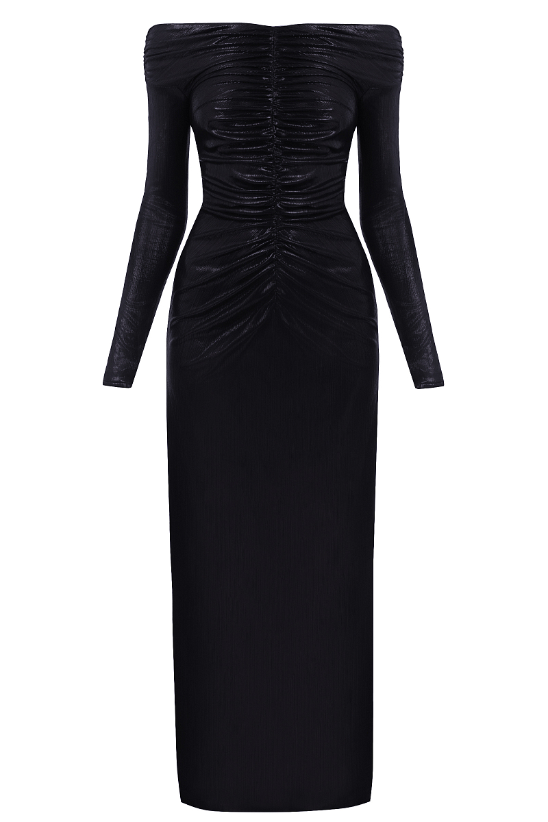 Платье макси со сборками российского бренда MARINA BUDNIK, сезон Осень-Зима. Состав: 95% полиэстер, 5% эластан. Параметры модели: 175/87/60/91, надет размер S. Цвет: черный.