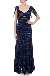 Платье макси бренда NORTHERN, сезон Осень-Зима. Состав: 96% шёлк, 4% люрекс. Параметры модели: 178/84/64/92, надет размер S. Цвет: синий, принт горох.