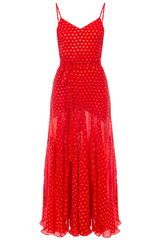 Платье макси бренда NORTHERN, сезон Осень-Зима. Состав: 96% шёлк, 4% люрекс. Параметры модели: 178/84/64/92, надет размер S. Цвет: красный, принт горох.