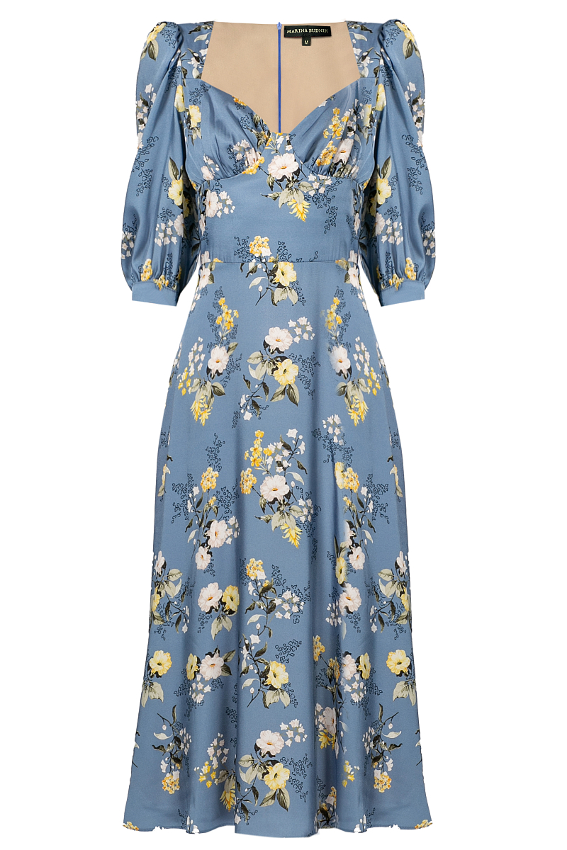 Платье миди российского бренда MARINA BUDNIK, сезон Весна-Лето. Состав: 100% вискоза; подклад- 100% вискоза. Параметры модели: 176/84/64/92, надет размер S. Цвет: голубой, цветочный принт.