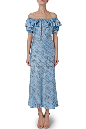 Платье макси российского дизайнера MAIZEL, сезон Весна-Лето. Состав: 90% полиэстер, 10% эластан. Параметры модели: 176/82/60/90, надет размер S. Цвет: голубой, принт горох.