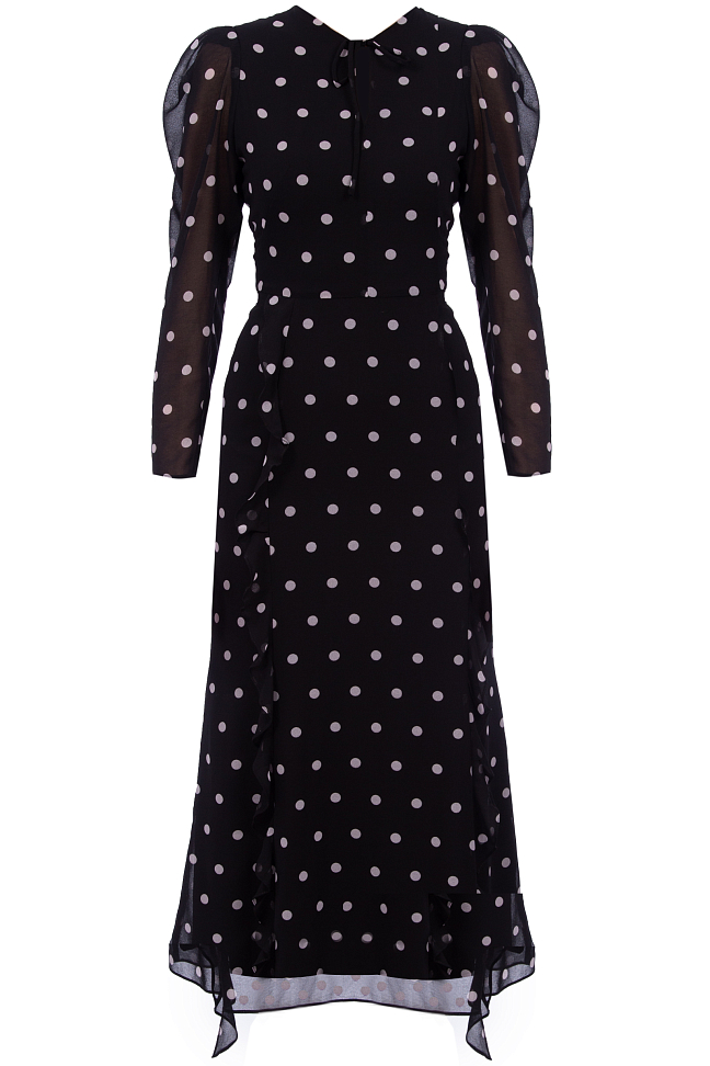 Платье миди российского дизайнера ERA, сезон Осень-Зима. Состав: 50% шифон, 50% полиэстер; подклад- 100% вискоза. Параметры модели: 178/85/65/93, надет размер XS. Цвет: принт горох. Размерная сетка: