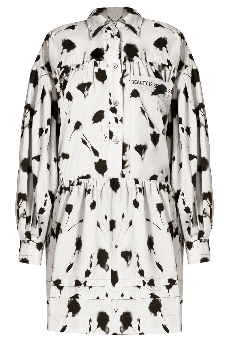 Платье мини российского бренда EVE&ESTHER, сезон Весна-Лето. Состав: 100% хлопок. Параметры модели: 176/84/64/92, надет размер one size. Цвет: белый, авторский принт.