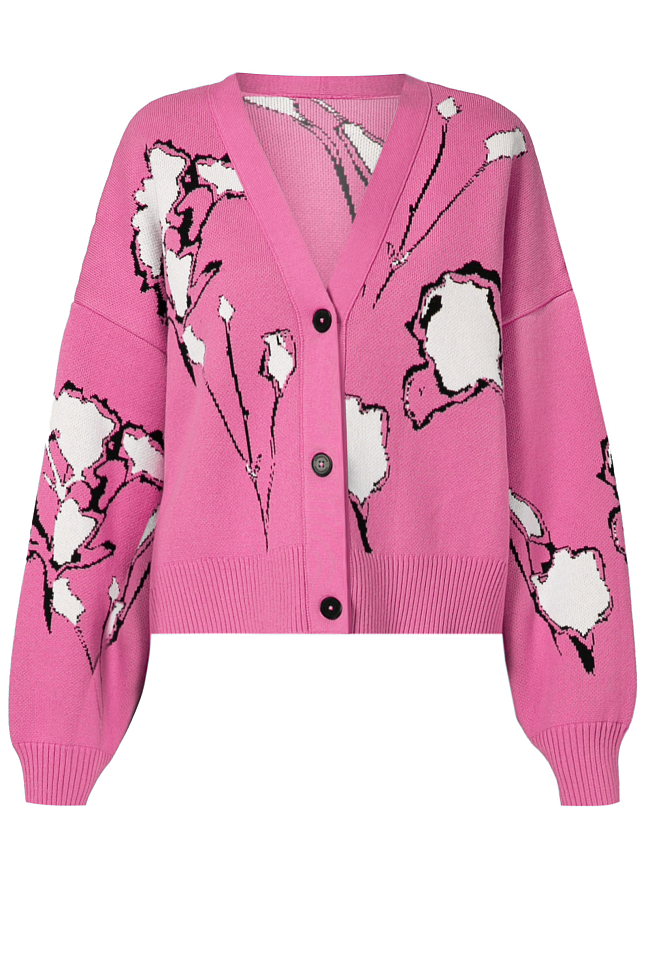 Кардиган российского бренда EVE&ESTHER, сезон Весна-Лето. Состав: 100% хлопок. Параметры модели: 176/84/64/92, надет размер one size. Цвет: розовый, авторский принт.