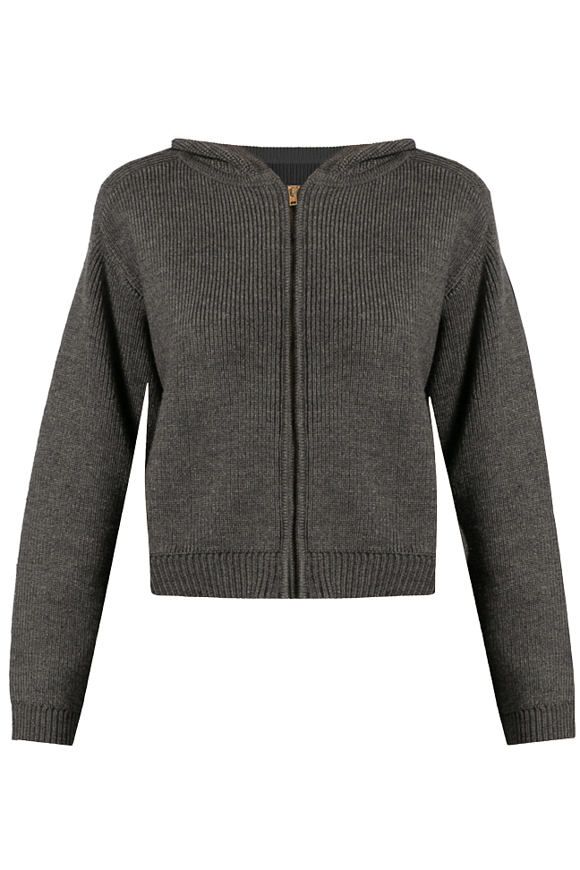 Трикотажный укороченный худи российского бренда PATRON CASHMERE. Состав:50% вискоза, 28% нейлон, 22% ПБТ. Параметры модели: 178/84/64/92, надет размер S. Цвет: серый.
