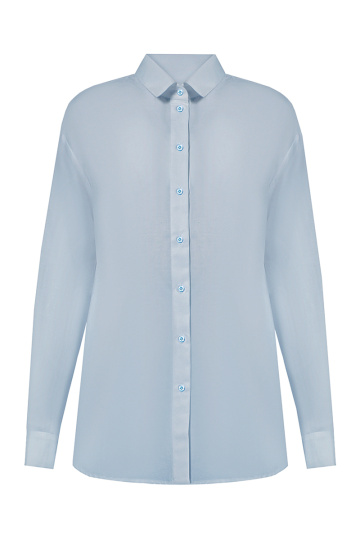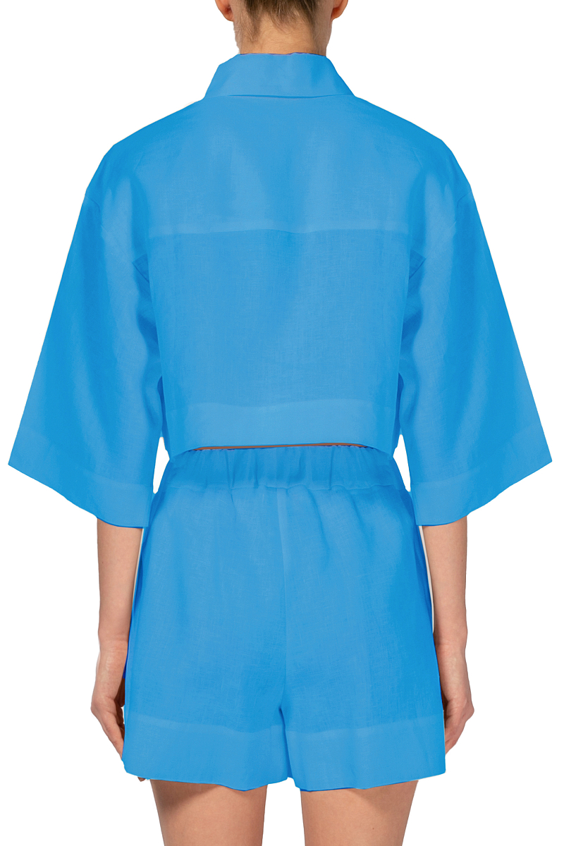 Рубашка укороченная российского бренда ADDICTED_TO…, сезон Весна- Лето. Состав: 100% лен. Параметры модели: 178/84/64/92, надет размер S. Цвет: голубой.