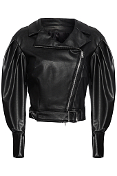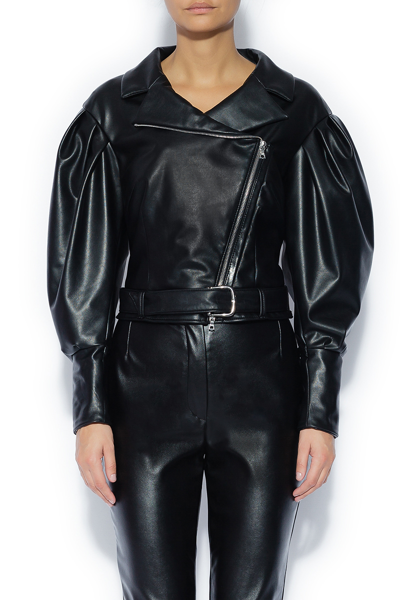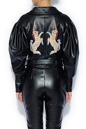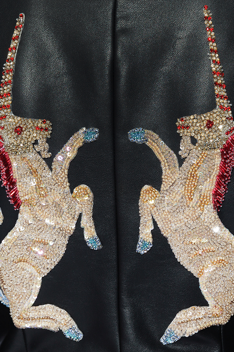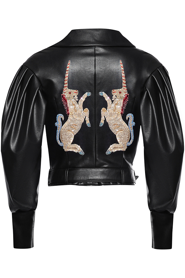 Косуха из эко-кожи с вышивкой единорогов из кристаллов российского бренда BESO TURÁ, коллекция Весна-Лето 2018. Состав: 100% эко-кожа. Параметры модели: 177/87/60/90 , надет размер S/M.