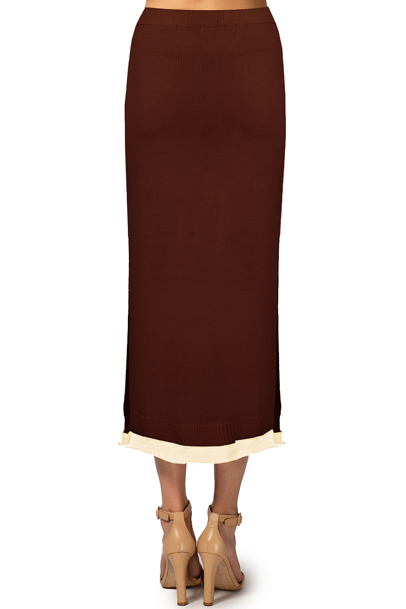 Трикотажная юбка миди российского бренда PATRON CASHMERE. Состав: 50% вискоза, 28% нейлон, 22% ПБТ. Параметры модели: 178/84/64/92, надет размер S. Цвет: бордовый.