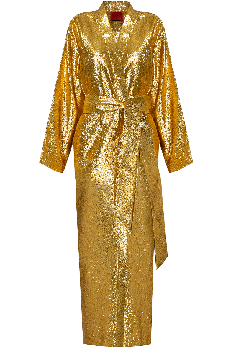 Кимоно российского бренда IZBA ROUGE. Состав: 100% полиэстер. Параметры модели: 176/84/64/92, надет размер one size. Длина изделия: 140 см. Цвет: золотой.