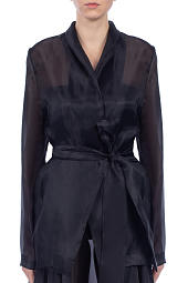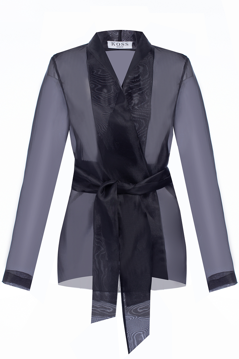 Кимоно из органзы российского бренда KOSS, сезон Осень-Зима. Состав: 70% вискоза, 30% полиэстер. Параметры модели: 175/87/60/91, надет размер one size. Цвет: черный.