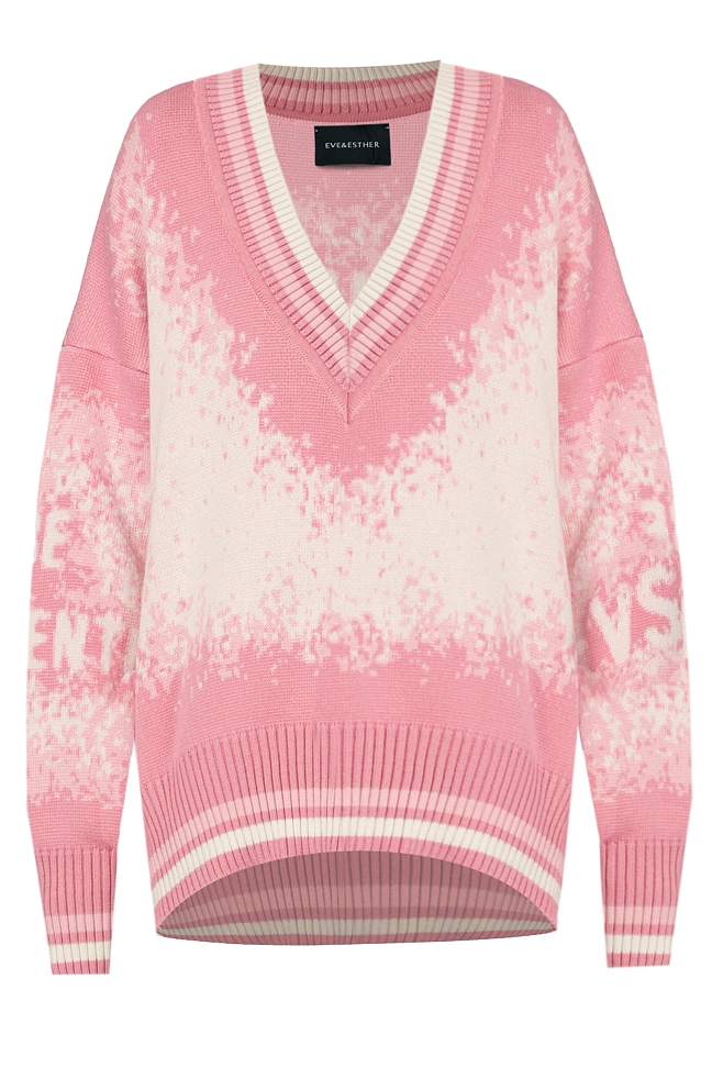 Пуловер российского бренда EVE&ESTHER, сезон Весна-Лето. Состав: 100% хлопок. Параметры модели: 176/84/64/92, надет размер one size. Цвет: розовый, авторский принт.