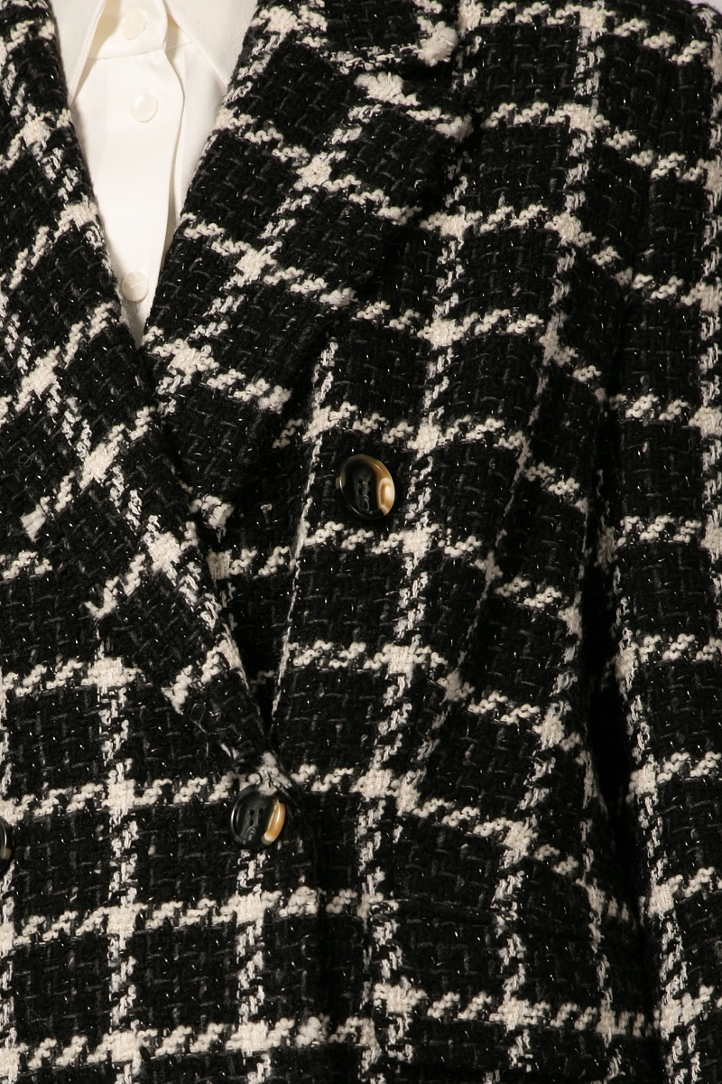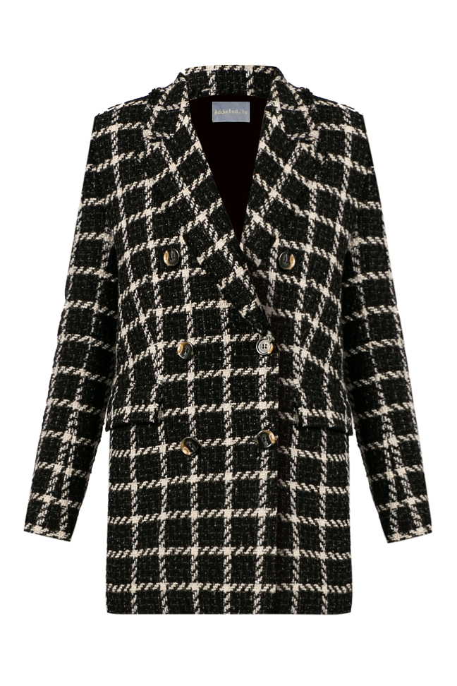 Двухбортный блейзер российского бренда ADDICTED_TO…. Состав: 65% шерсть, 20% вискоза, 15% полиэфирное волокно; подклад: 100% вискоза. Параметры модели: 178/84/64/92, надет размер S. Цвет: черный в белую клетку.