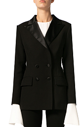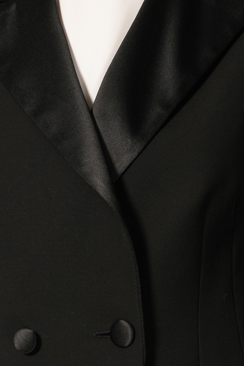 Жакет приталенный с атласными лацканами российского бренда SANS MERCI, сезон Весна. Состав: 100% шерсть, подклад- 70% вискоза 30% шёлк. Параметры модели: 178/84/64/92, надет размер S. Цвет: черный.