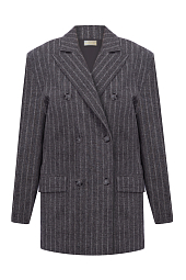 Жакет двубортный российского бренда ADDICTED_TO…, сезон Осень-Зима. Состав: 52% шерсть, 33% вискоза, 15% полиамид; подклад-100% вискоза. Параметры модели: 178/85/65/93, надет размер S. Цвет: серый принт в полоску.