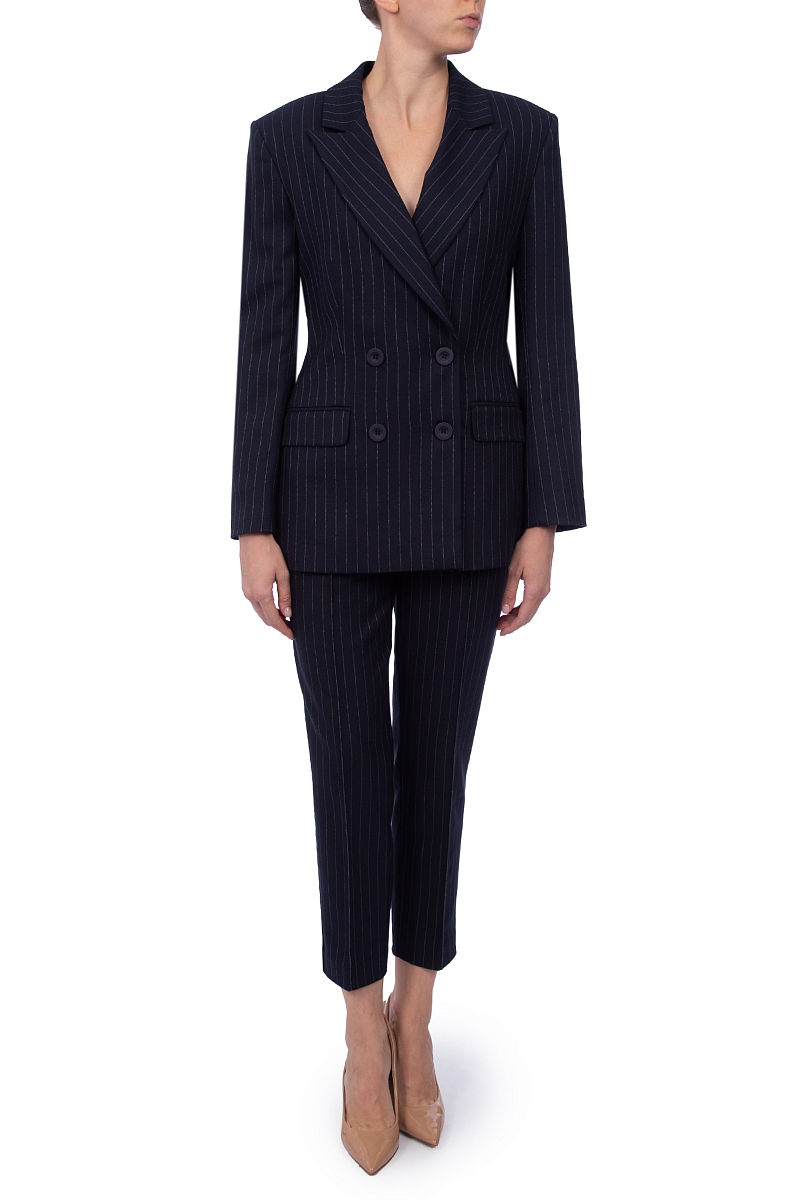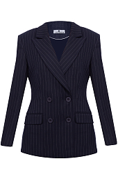 Жакет двубортный российского бренда LAROOM, сезон Осень-Зима. Состав: 65% полиэстер, 32% вискоза, 3% эластан. Параметры модели: 178/85/65/93, надет размер S. Цвет: синий, принт полоска.