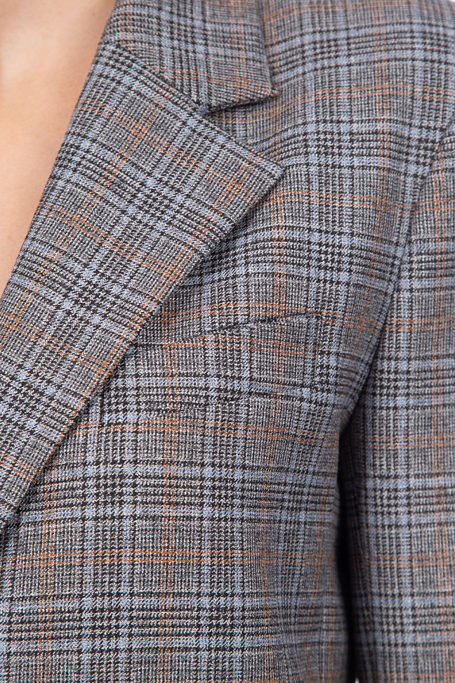 Жакет прямой российского бренда LILA, сезон Осень-Зима. Состав: 70% вискоза, 25% полиэстер, 5% эластан; подклад-100% вискоза. Параметры модели:178/85/65/93, надет размер S. Цвет: серый, принт в клетку.