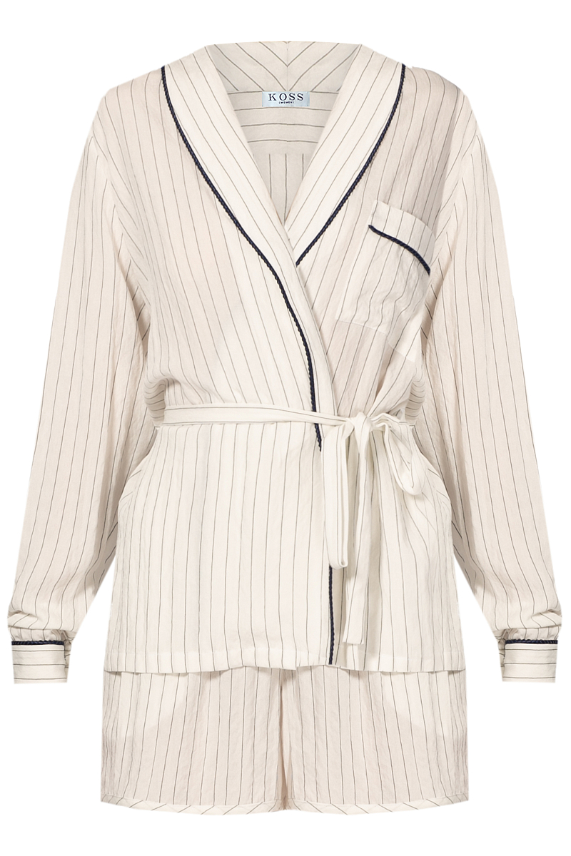 Костюм российского бренда KOSS, сезон Весна-Лето. Состав: 100% хлопок. Параметры модели: 176/84/64/92, надет размер S. Цвет: белый, принт полоска.